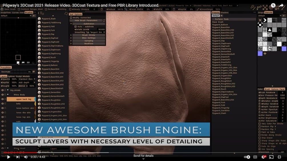 Hey todo mundo, disponibilizado gratuitamente o brush do 3DCoat, chamado Rygaard Apply Details que contém 68 brush tips que foi criado e usado durante o processo de detalhamento dos rinocerontes.